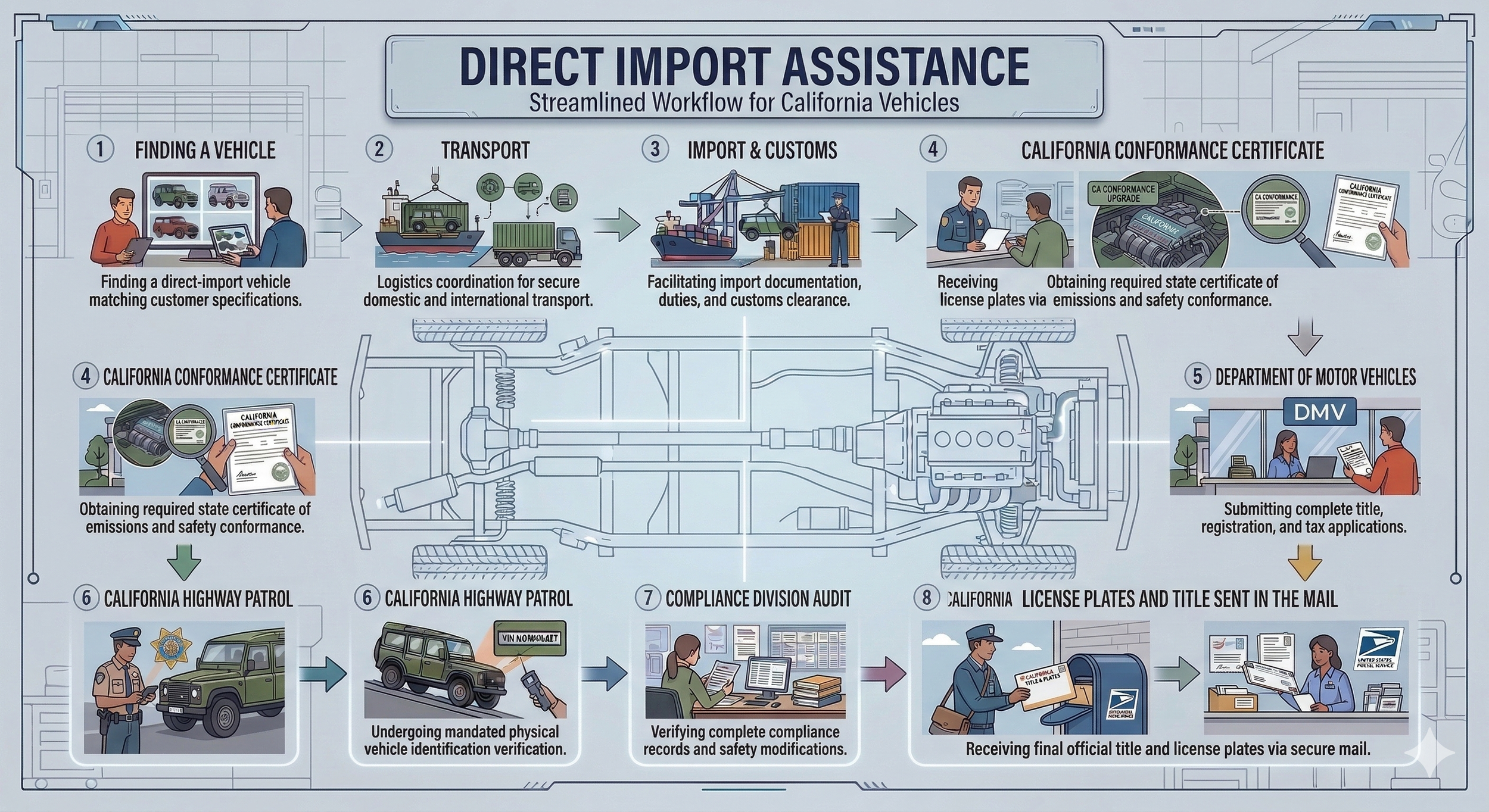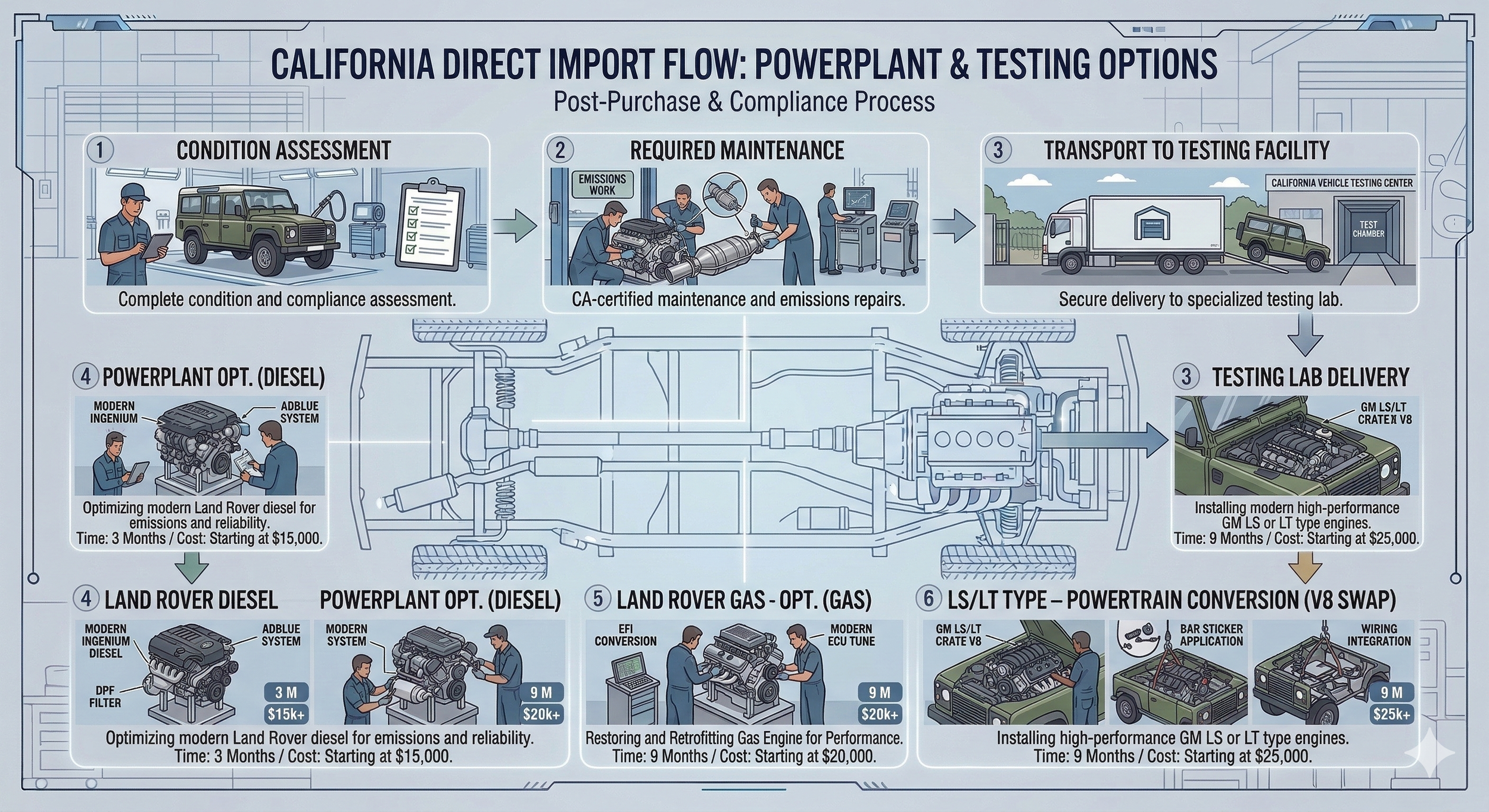 At Defender Traders, we specialize in making sure your Land Rover Defender meets all California regulations. Whether it's a direct import or a local vehicle, our expert team ensures full compliance with state laws. Visit us in San Diego, California, and let us handle the details so you can enjoy your Defender with confidence.